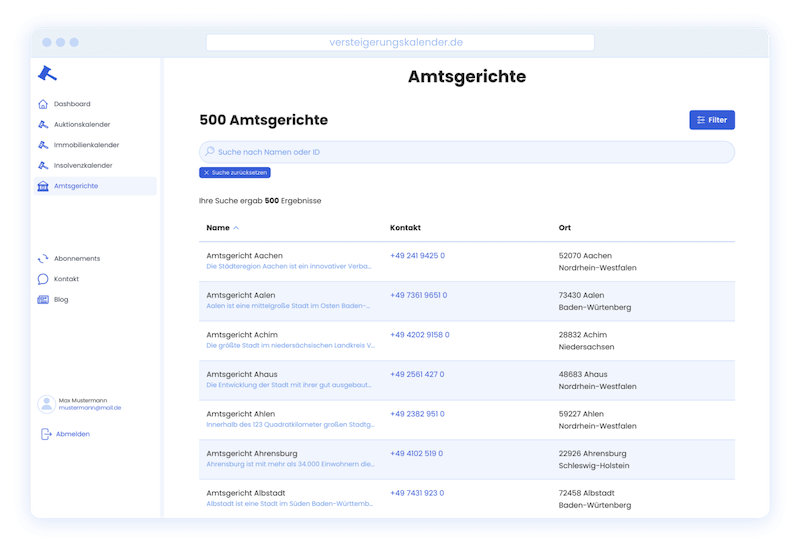 Deutschlandweit alle Zwangs- und Teilungsversteigerungen von Immobilien mit vollständigen Adressen, Termine und Objektdaten mit Such- und Selektionsmöglichkeiten.