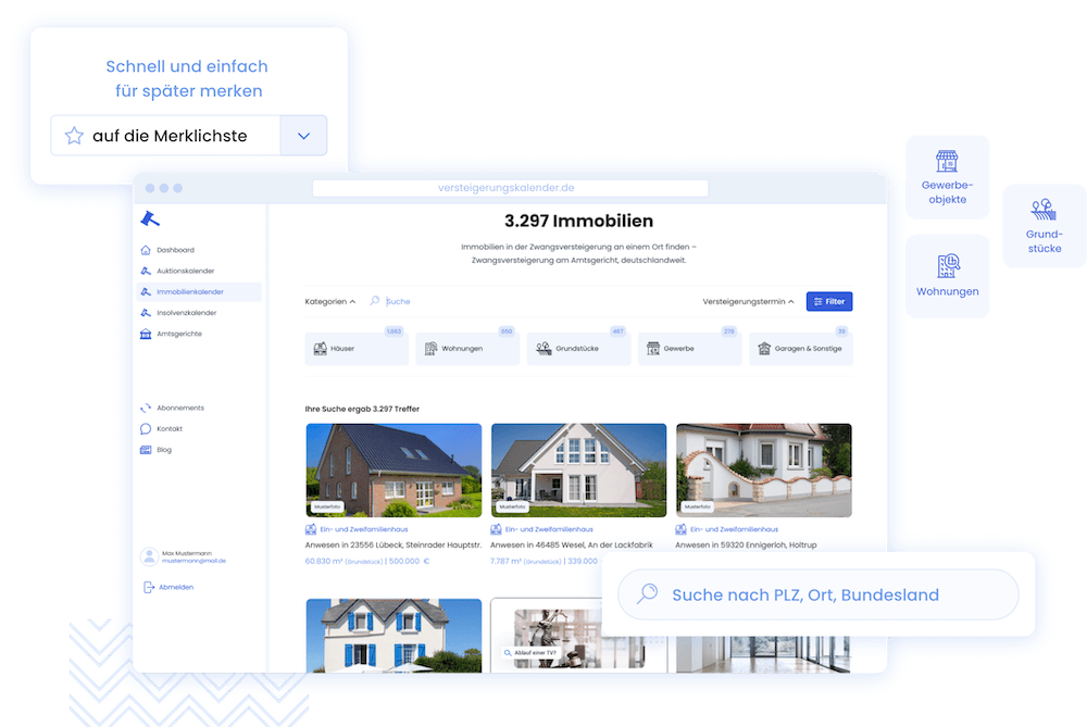 Ersteigern Sie eine Immobilie zum Schnäppchenpreis! Im Immobilienkalender finden Sie bundesweit ALLE Immobilien in der Zwangs- und Teilungsversteigerung – vielfach mit ausführlichen Gutachten/Exposés, Originalbildern und allen wichtigen Informationen, die Sie benötigen, um erfolgreich eine Immobilie zu ersteigern.