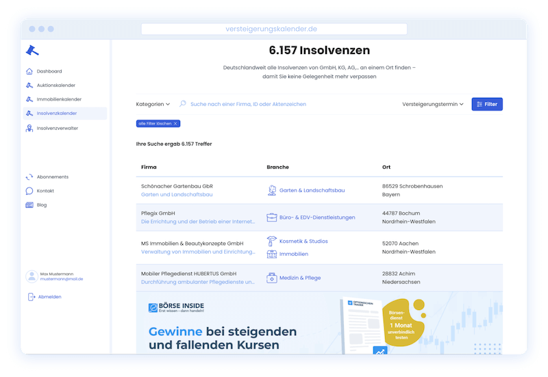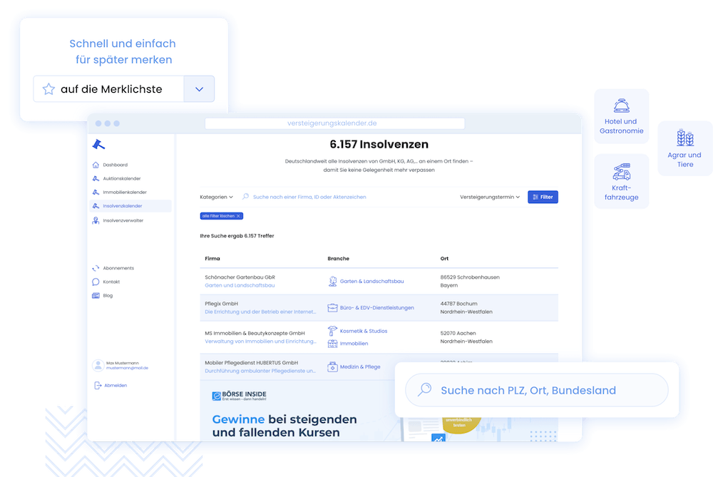 Nie wieder wichtige Angebote verpassen – mit Ihrem persönlichen Suchauftrag! Mit unserem Suchauftrag-Service finden Sie automatisch genau die Insolvenzen, die Sie interessieren – ganz ohne tägliche, zeitraubende Suche. Legen Sie einfach Ihre Filterkriterien fest (z. B. Branche, Region) und wir übernehmen den Rest.