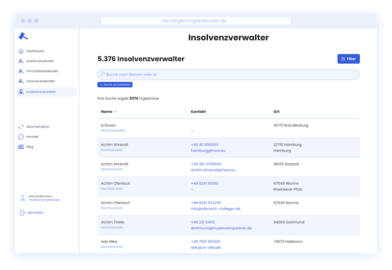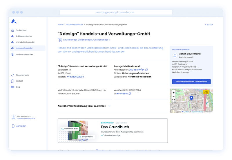 Schreiben Sie unsSie können in unserem Insolvenzkalender alle spannenden Insolvenzbekanntmachungen inklusive den Kontaktadressen zum Insolvenzverwalter bzw. Rechtsanwalt. Damit können Sie sich persönlich an Insolvenzverwalter, Banken oder spezialisierte Makler wenden.